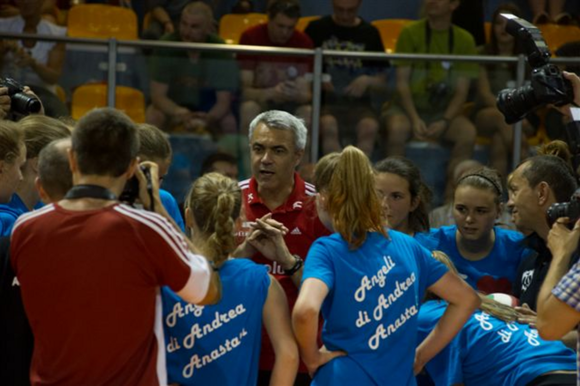 Po przyjeździe trenera Anastasiego na boisko wyszły Sokolanki oraz drużyna z zawodniczkami reprezentacji. Największym zaskoczeniem dla trenera była niespodzianka jaką przygotowały zawodniczki występując w koszulkach z napisem kocham siatkówkę, a chwilę późnie na komendę pokazały napis umieszczony na plecach „Angeli di Andrea Anastasi”. Dla młodych Sokolanek występ przeciwko starczym koleżankom, zawodniczkom reprezentacji był wielkim przeżyciem. Trener chcąc zmotywować swoje zawodniczki obiecał im obecność na treningu reprezentacji mężczyzn w Spodku oraz sesję zdjęciową z zawodnikami.