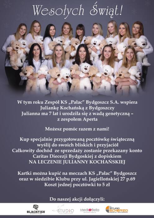 Z tej okazji klub przygotował specjalną kartkę świąteczną, którą będzie można kupić w trakcie najbliższego meczu z Budowlanymi Łódź. Spotkanie odbędzie się 23 grudnia o godz. 17:00. Kartkę dostanie każda osoba, która dołączy do akcji – wrzuci do puszki pieniądze dla Julianki w kwocie minimum 5 zł. Cały dochód ze sprzedaży kartek zostanie przekazany na konto CARITAS DIECEZJI BYDGOSKIEJ – z dopiskiem NA LECZENIE JULIANNY KOCHAŃSKIEJ.