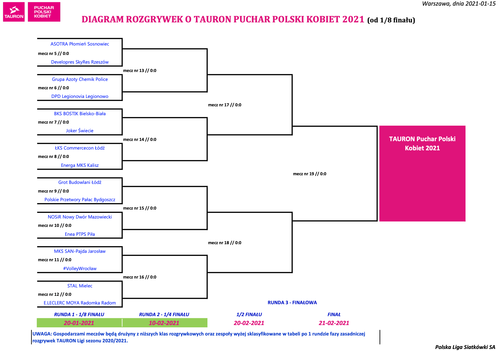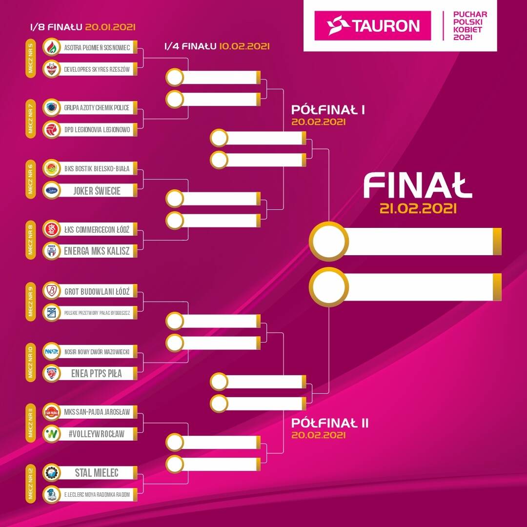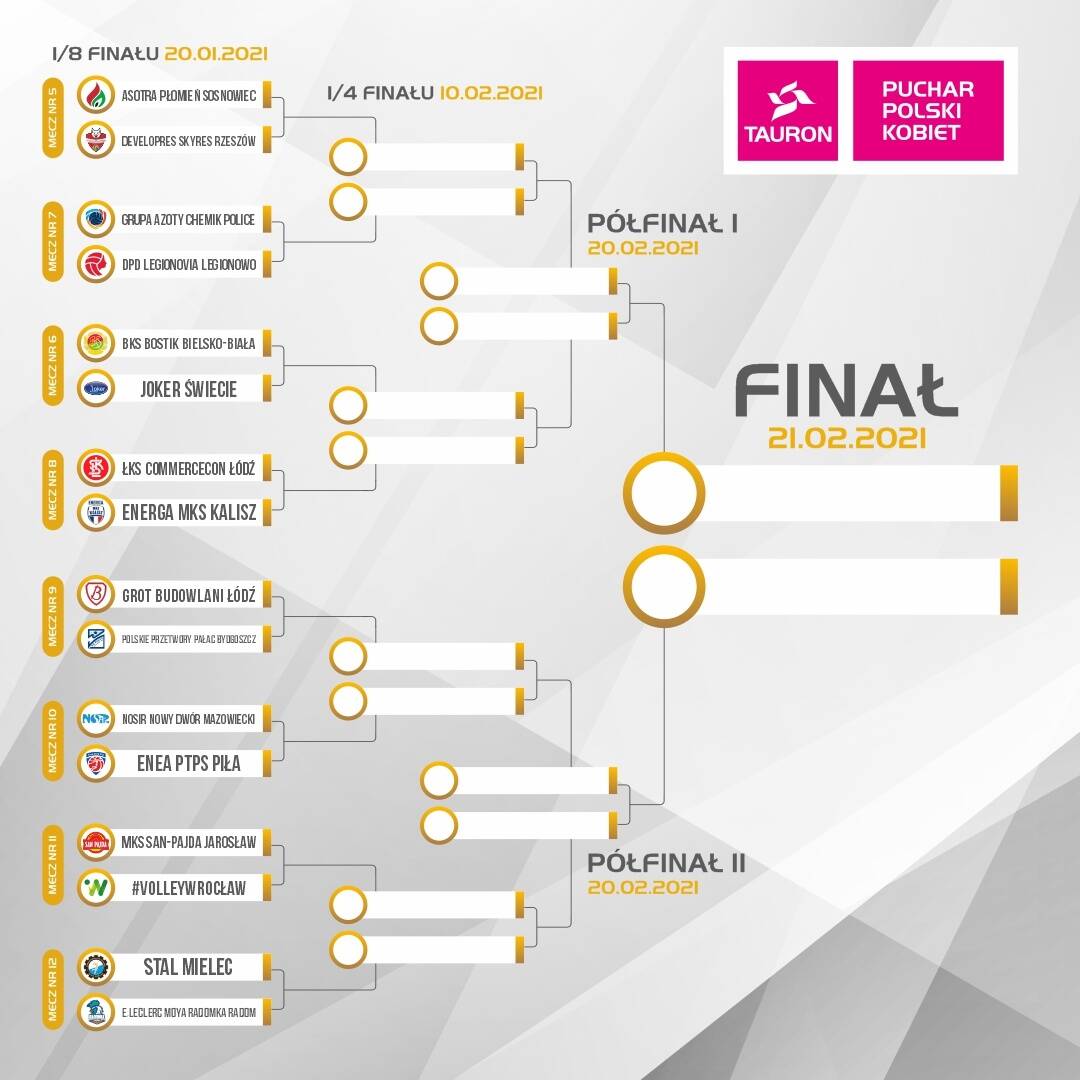 Mecze 1/8 finału rozgrywane będą już w przyszłym tygodniu, planowy termin to 20 stycznia (dokładne daty każdego z meczów podamy w następnym komunikacie). Decydujące o awansie do wielkiego finału mecze ćwierćfinałowe będą rozgrywane 10 lutego, turniej finałowy w Nysie w dniach 20-21 lutego 2021 roku.